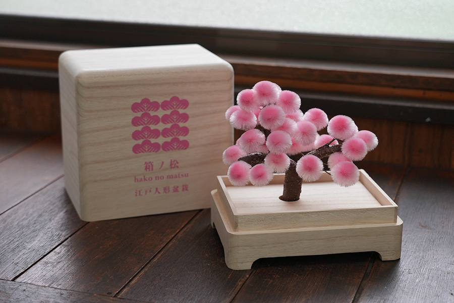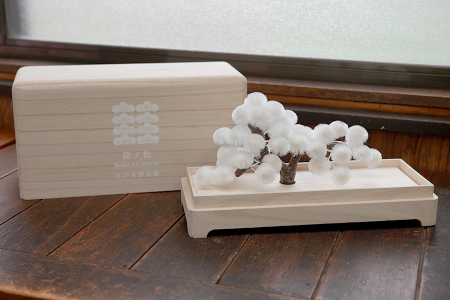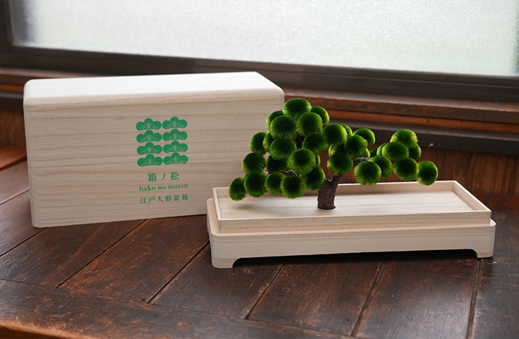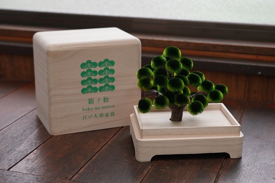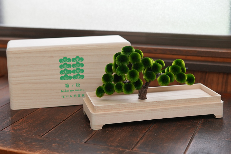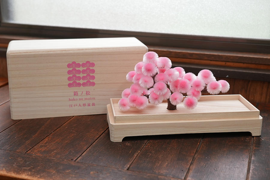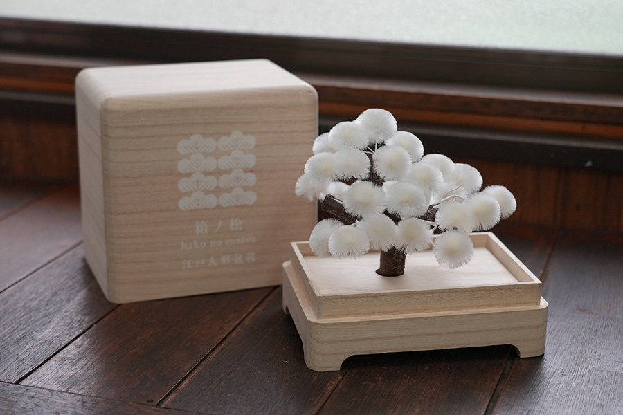 「箱ノ松」は、高砂の松を主役に据えた独創的な江戸人形盆栽てす。桐箱を開けると、匠の技が生み川す精緻な松が現れ、幾世代に渡り受け継がれてきた人形造花ならではの世界観が広がります。